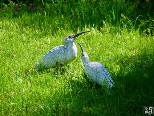 池は朱鷺の餌場となる水田を模した構造になっているようだ。水路にあたる部分が玉石張りになっている。訪れた際は池は収穫後の水田に様相に合わせたのか、草地になっていたが、左手に見える白いものはよもや、つがいの朱鷺?新潟県最大の湖沼、加茂湖の西岸…