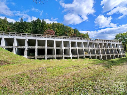 有形登録文化財にもなっているバットレスダム構造の堰体であるが、堤高は15mのハイダムスペックを満たさないため、いわゆる現存バットレス6基の数には入っていない。 数字に入っていない第七のバットレス。 紅葉の盛り。奥津発電所調整池の直下にある奥津温…