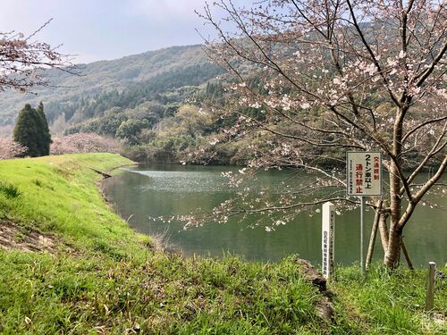 流れるような山なみを背景に、やわらかく草に覆われた堤と桜がよく似合う。四連の池のいちばん下の池。直下は有明海に面した干拓農地。 当時の有明町長による改修記念碑をはじめ、長文の碑文が二つ掲げられていたが、判読できた文字から「深浦溜池土地改良区…