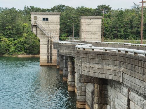 【漢那ダム湖畔公園】左に重力式コンクリートの主ダム、右にロックフィルの脇ダムが見える 全国に先がけて、景観と環境を考えたダム湖。 沖縄北部にある国営「やんばる9ダム」のひとつ。 重力式コンクリートの主堤(主ダム)とロックフィルの副堤(脇ダム)…