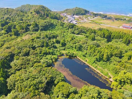 海を眼前に直線的な堤と真っ黒な水が印象的な池だ能登半島の海を見おろすなだらかな丘陵地に横たわる黒い水面。直線的な堤は明らかに人の手によるものだ。しかし池と呼ばず、その名は「上の大渕」。刺激的な池だ。 二車線道路はこの池を捲くように丘陵を駆け…