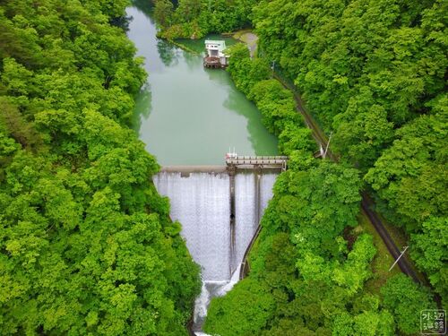 電源開発の水力発電専用ダム。堤頂幅いっぱいに越流するデザインはオーバーフロー時にはナイアガラのような美しさ。 じつはこのダム、それだけではない秘密が(?)。 道路側から見て手前には、導水管からの通水口(管理棟はこの上に建てられている)が設け…