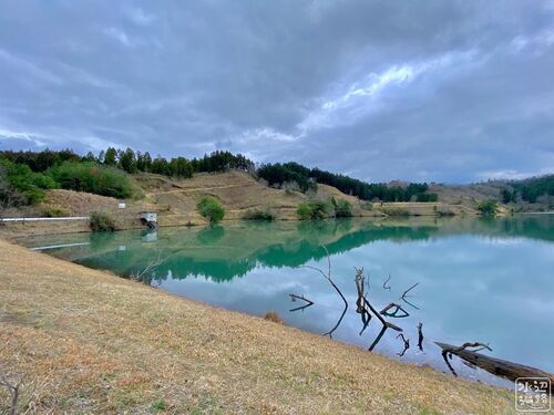 ロックフィルダムが堰く農業用貯水池。 湖畔に予約不要の無料キャンプ場がある。 ワカサギ放流につき遊魚料設定ありとの看板が倒れていた。ブラックバスをあしらった看板には湖岸に降りないようにと記されていた。 マークした場所にキャンプ場。