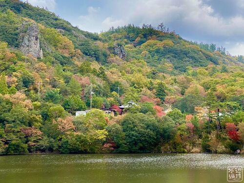 池畔に鐘が置いてあるのは初めてかも奇岩と寺と湖面がせめぎ合う小豆島の奥離のような池。 堰体横に鐘が・・。 見えているところにお寺もあるのに、と思ったが、この場所に鐘撞き堂を建立したいので寄進を募る、という目的でここに置いているとのこと。 でも…