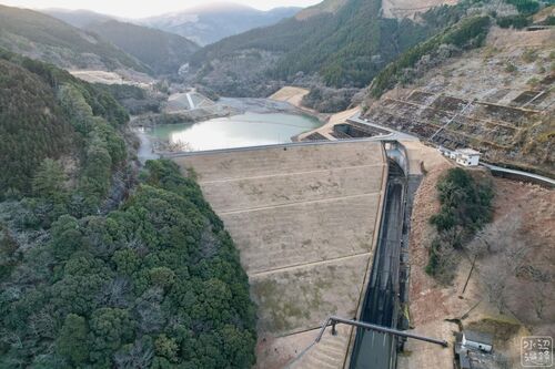 せいがんじだむ。さすが日本一の高さを誇るアースダム。堰体が長〜い。(2022年撮影) アースダム日本一! 紀元前のメソポタミア文明から造られてきたのが土盛りによるアースダム。日本では、特に堤の高さが15m以上のものをアースダムと呼ぶ。 平安時代末期…