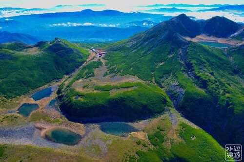 五ノ池を左側に押し込んだ火口丘の地形に惚れ惚れ。右上にチラ見えしている天空の池は権現池。乗鞍岳山頂湖沼群のひとつ、というか五つの池が頭を寄せるように集まっている。 湖面標高2,700mほど。カルデラ湖が中央火口丘の発達と溶岩流によって押し出され鎌…