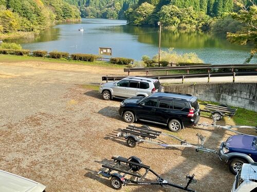 【せりかわだむ / 芹川ダム公園】バスボートのトレーラー車列と湖面に浮かぶバスボート(2022年撮影) ブラックバス釣りに禁漁期間が設定されためずらしいダム湖 県営の補助多目的ダム。 このダム湖は2016年の訪問時において、ブラックバス釣りに関しても禁…