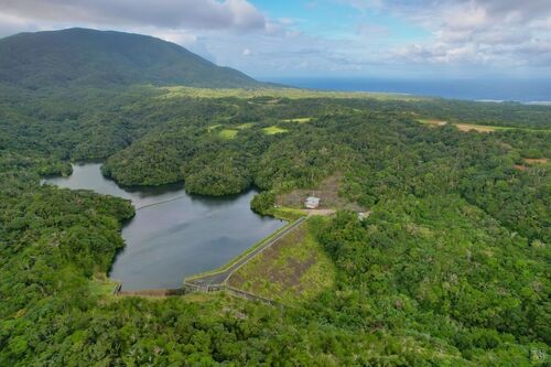 徳之島の最高峰・井之川岳(645m)を後ろに控えた神嶺ダム。海も見える。(空撮 / 2022年)徳之島の最高峰・井之川岳(645m)を水源とした貯水池。 この池を堰くのは堤高33mのじつに堂々としたアースダム。離島のアースダムとしては、なかなか見られないスケ…