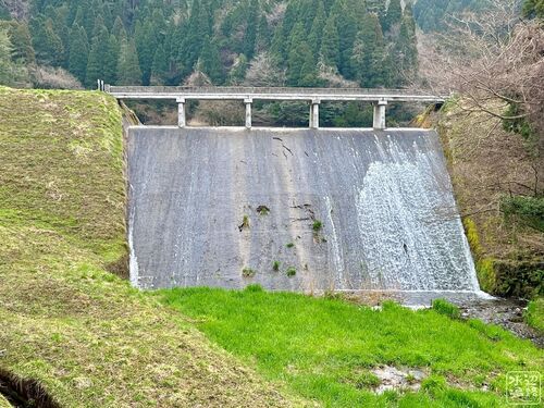 かどのいけ。 洪水吐となめらかに続く流路工が美しい溜め池。