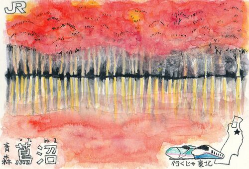 【つたぬま / 蔦の七沼(蔦七沼)】朝焼けで赤一色になる蔦池の紅葉は、JRをはじめ秋の観光ポスター指定席。新聞、テレビでも毎年、季節のたよりとして紹介される。JRポスターをもとに絵にしてみた。 至極の紅葉写真スポットで国立公園 蔦沼は400mほど遊歩道…