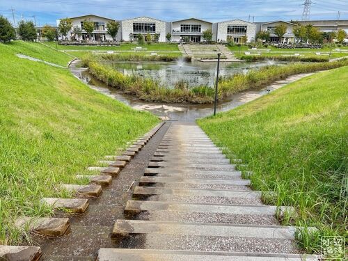 先駆的な調整池改修で街の価値を向上させる「アクアテラス」構想 ストリートファーニチャーから防災ファーニチャーまで手がけるコトブキ社も参加し、官民協力のもと民間出資で最新型にリニューアルされた調整池の事例。 フェンスに囲まれ無機質だった調整池…