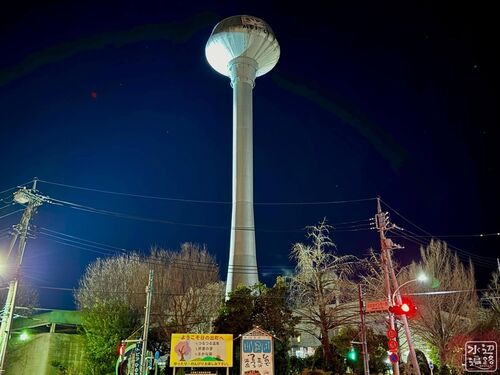 ダイヤモンド給水塔!(2024年9月撮影) 圏央道から見える給水塔タイプの配水池 「MeITO」の文字と旭日旗のようなマークが印象的な円盤タイプの給水塔。 給水塔や配水池と呼ばれるタンク型の人工池であるが、協働乳業の工場の中にあるだけに、あるいは中に入…