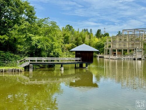 工事中なのが少し残念だったが、ご覧のように現代アートを組み合わせた池泉回遊式庭園の奥には連続的に大きな溜め池が。こんな水景はちょっと見たことがなくてテンションが上がりまくり・・ 里山の魅力を再現しつつ現代建築と池泉庭園をミックス けいはんな…