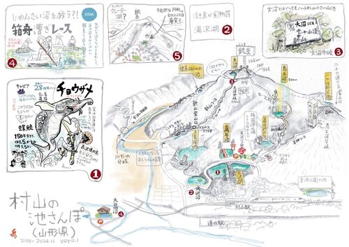 「肘折湖」という湖は地図上では存在しない。肘折温泉のある土地の地形から、かつてここにカルデラ湖があったのではと思っての妄想。アニメ「君の名は。」の舞台になった糸守湖にも似た規模感かも。