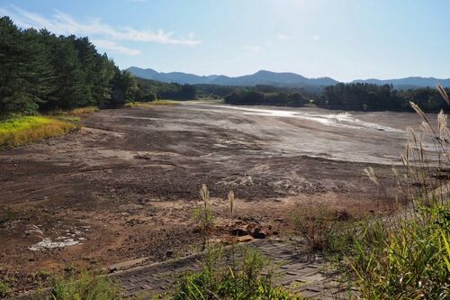 【ちんちょうち / 旧海軍大湊要港部水源地堰堤】訪れた2021年夏には堰体の大規模改修工事中で完全水抜き状態。ここで「超ラッキー」と思ったあなたは、かなりの池マニア。 沈澄池。その池の水は日本海軍の戦艦も潤した 「旧海軍 大湊要港部 水源地堰堤」とも…