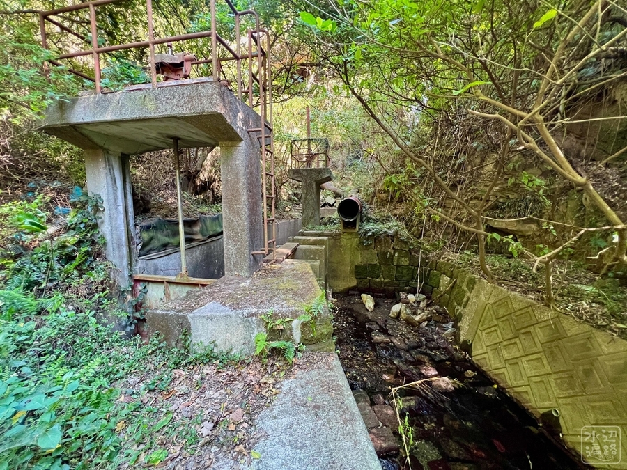 上に橋が見える。奥が池田湖になるが、これより先に歩道なり管理道なりはなく、細部を確認することはできなかった。トンネル式ではなく開渠に見えるが、工事時の古い写真を見ると石積みアーチのトンネルらしきものが写っている。現在もパイプが通っている。