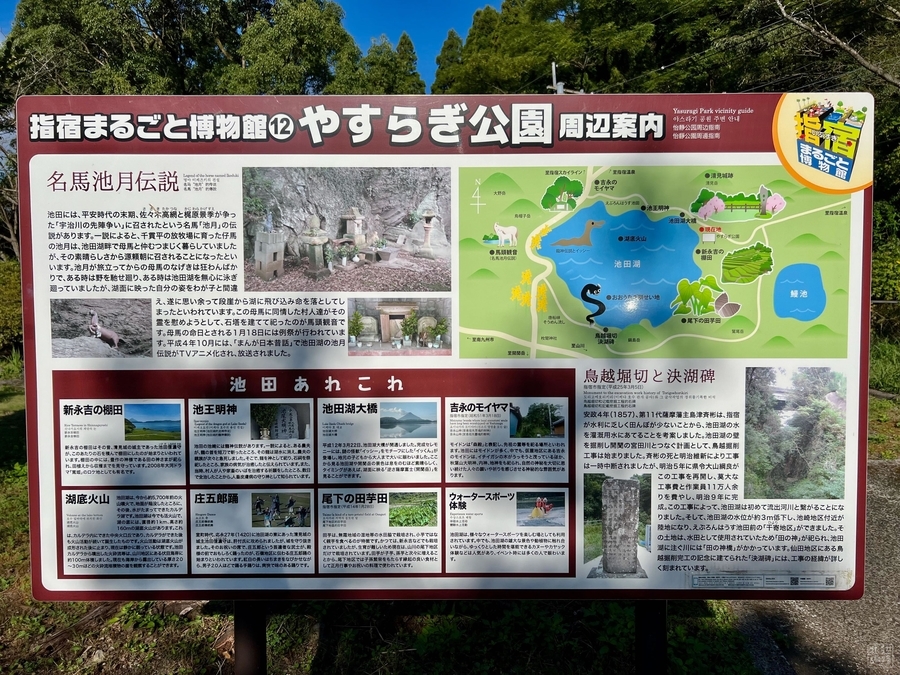 江戸時代末期に島津斉彬が池田湖のカルデラ外壁を突貫して湖水をかんがい用水に利用することを思いつく。当初、池田湖の水神の祟りを恐れて工事担当者が逃げ腰だったところ、さすが明君・斉彬、「人に役立つことをして喜ばぬ神などおろうか」と工事を強行。しかし翌年、斉彬は亡くなり江戸幕府も消滅して工事は中断。これってやっぱり祟り?