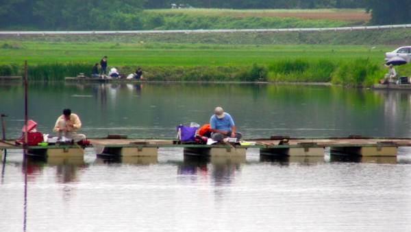 2013-03-14 兎谷津沼(茨城県猿島) 茨城県 うさぎやつぬま。兎谷津へら鮒センター 田園地帯の野池の雰囲気が魅力の池。よく釣れるので釣り人も多いが、広さがあり混雑による圧迫感は感じないだろう。桟橋からの釣りができるほか、釣り座の設置してある陸釣りポイントも多く、釣り台は不要。釣り座のすぐ後ろにクルマを停められるのも便利。トイレ、自販機あり。女性の徴収員が入漁料1000円を徴収しにくる。そのほかお弁当屋さんもまわってきてくれる。 マブナや半ベラみたいのがよく釣れたが、しっかりした体型のへらももちろんいる。ダブルで釣れるほど魚影は濃い。