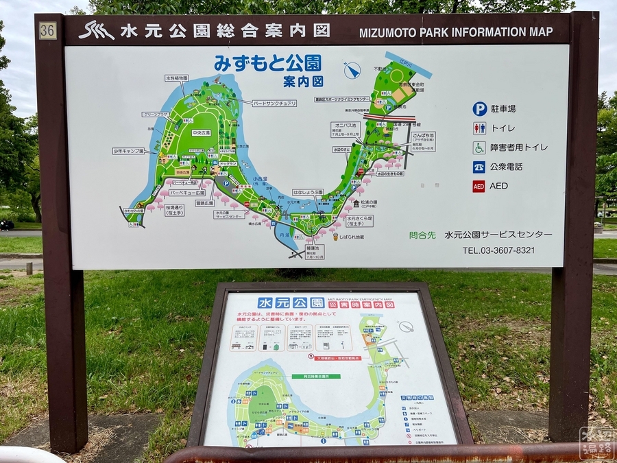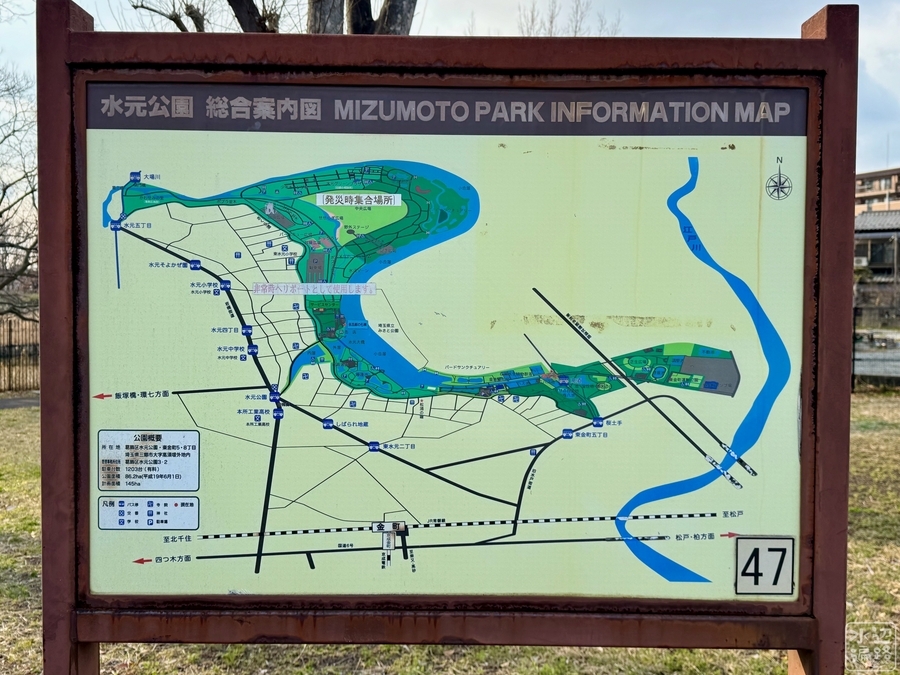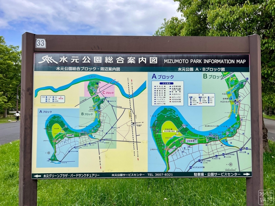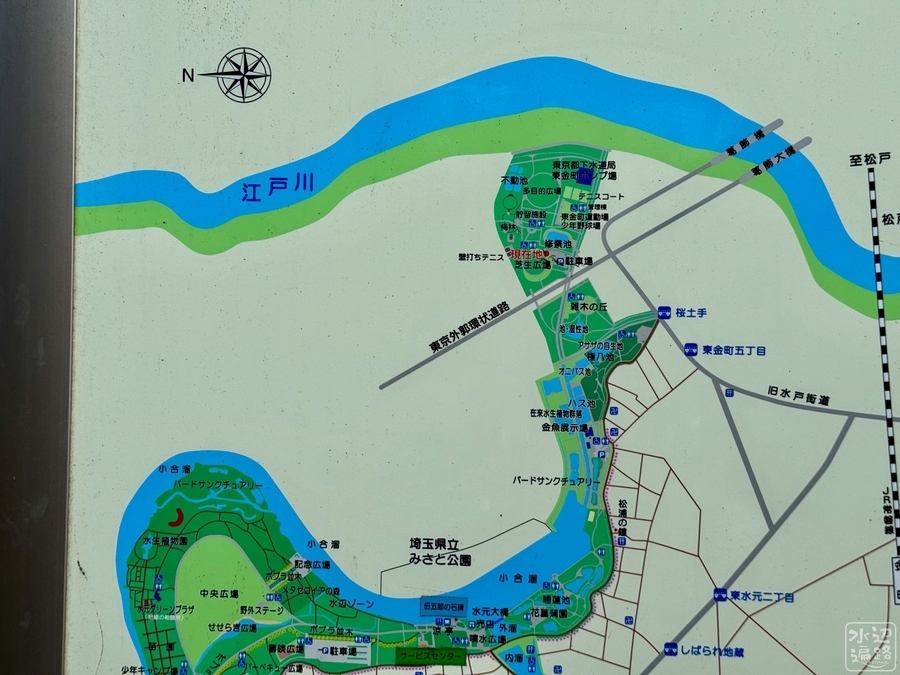 公園は長さ3.5kmの逆S字形の小合溜を中心に、釣り池、かわせみ池など複数の池がある。また小合溜の対岸側は一部、埼玉県のみさと公園の構成要素にもなっている。