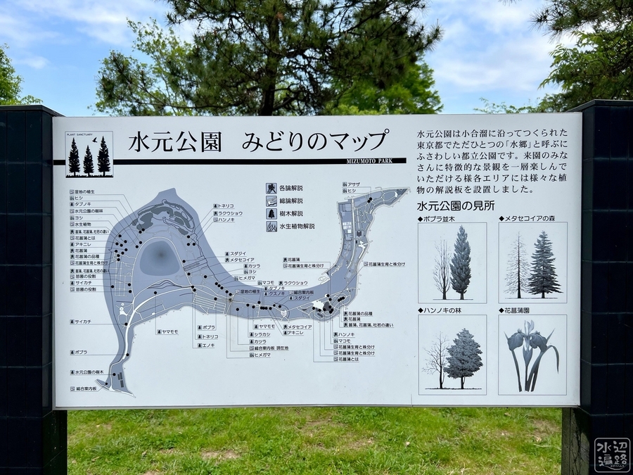 小合溜を中心に、ごんぱち池、オニバス池、水生植物園、ミジンコ池など複数の池が、貴重水生植物保護ゾーン、水生植物観賞ゾーン、現況保存ゾーン、水辺環境ふれあいゾーンといったテーマに沿って配置され、それらをゆるやかに結ぶ遊歩道はメタセコイヤの森など豊かな植生に彩られている。