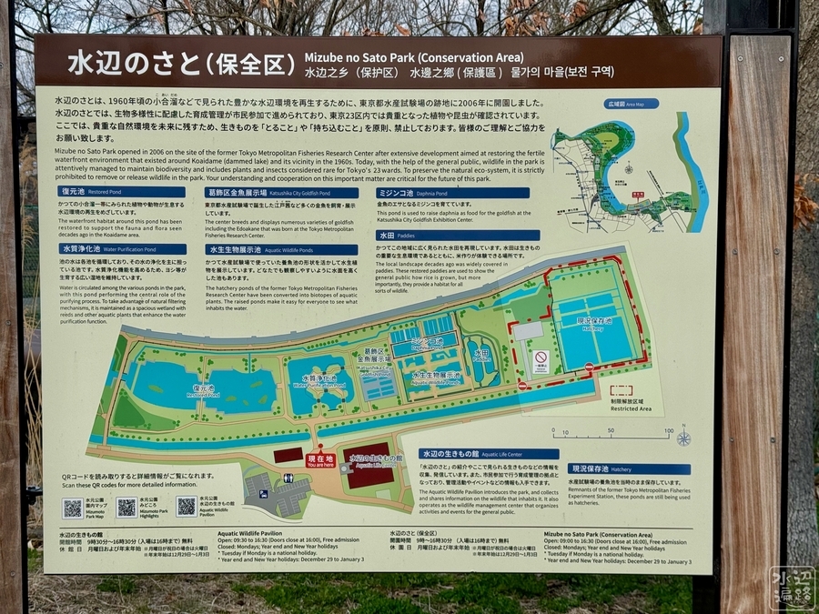 歴史をたどると、戦後の食糧難を打開すべくタンパク源として注目された鯉、鮒の増殖を行う水産試験場だった時代もある。水産試験場という歴史資産と、水郷がもたらす豊かな動植物を含めた自然遺産とを維持・保存するコンセプトのもと、都の事業として公園化された。