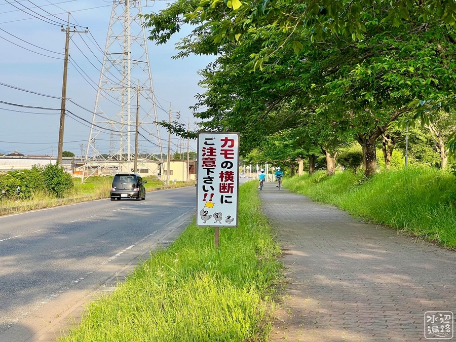 「カモの横断にご注意」の看板