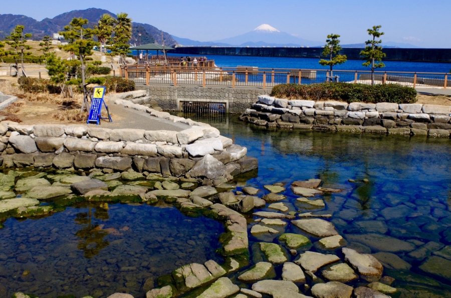 海岸の親水広場に設けられた修景池には、駿河湾の水深300mから引き込まれた海洋深層水が流れ、年間を通じて水温10度前後の深層水に触れて体感することができるだけでなく、晴れていれば防潮堤の向こうに富士山が美しい。潮だまりを再現した人工水辺は子どもにも人気。