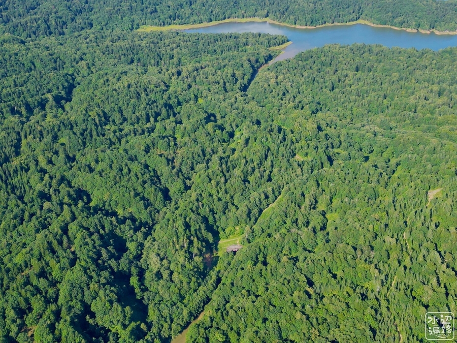 西隣の宇津内湖との間には連絡水路があり通水している。下の空撮写真では奥深くまでのびた樹枝状のワンドの奥にコンクリートの通水口(橋)が見える。水の色は二つの湖でまったく異なっていた。通水部に直接行ってみたかったが、アクセスする林道はチェーンゲートで一般車両は入れない状態だった。