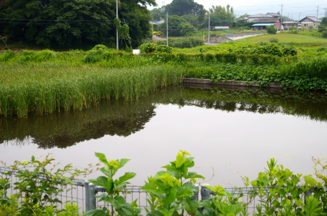 池のきれいに半分がヨシに覆われる。フェンスあり。