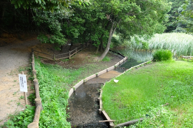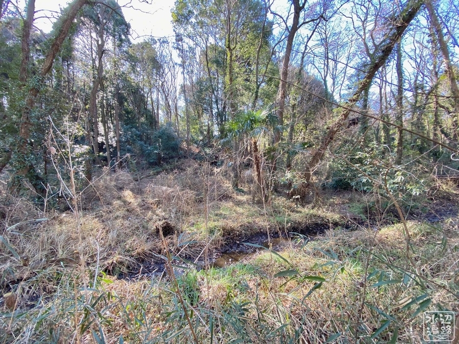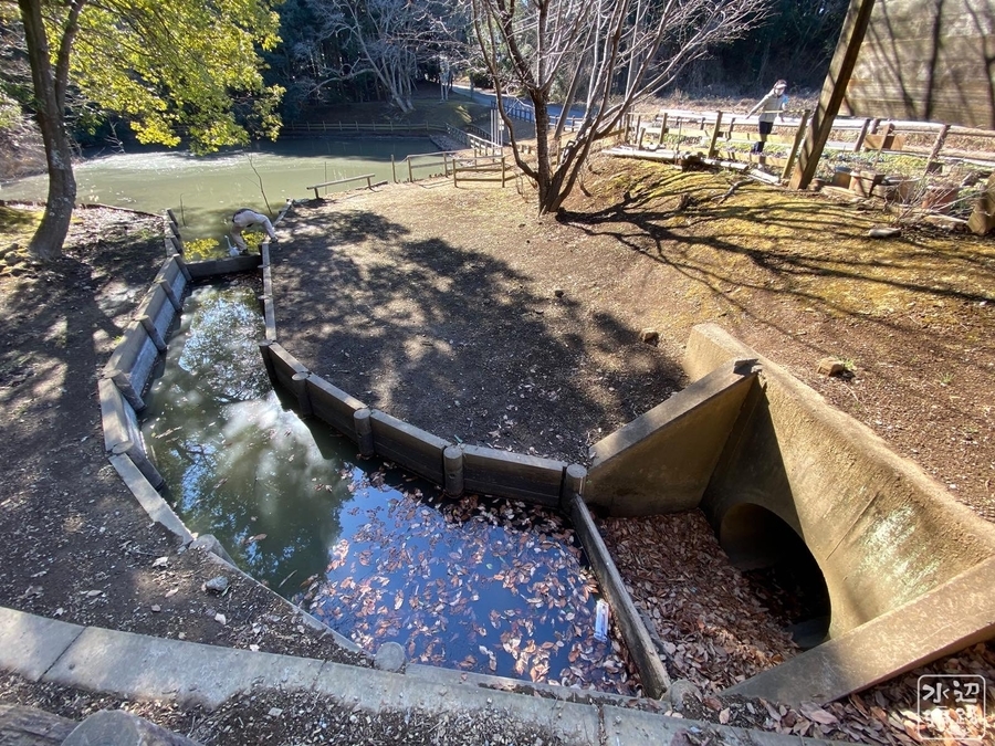 現在の姿では道路のサグ部が堤のようになっており、吐き出し口は道路下をくぐって市民プールの方向に谷戸に沿って流れ出している。