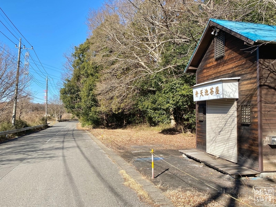 池からは遊歩道やベンチなどがゆるく整備されており、ウォーキングコースも設定。道をはさんで弁天池茶屋なる小屋も。