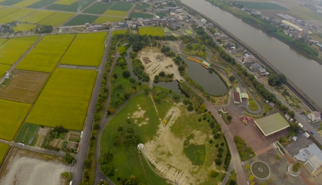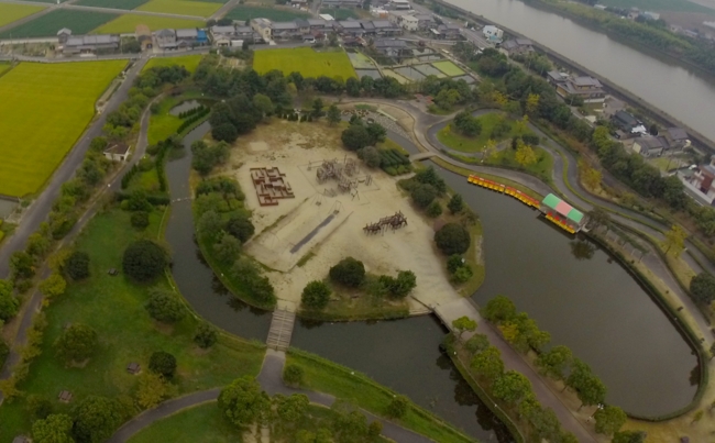 斜面広場に大型すべり台。ほか、広場、遊歩道、駐車場、トイレあり。