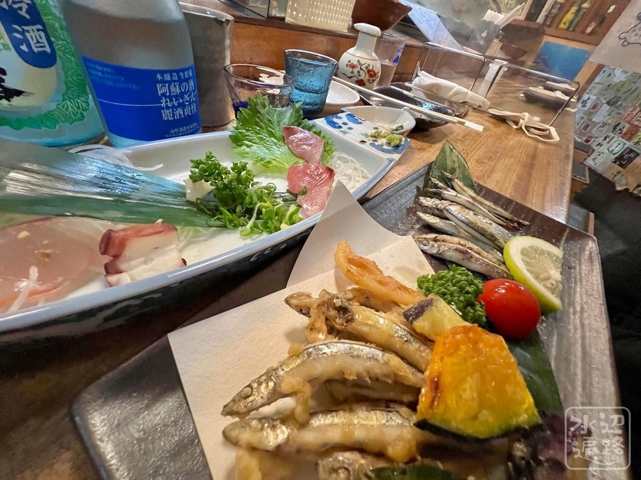 マグロ納豆はあれど馬刺しをあえた「サクラ納豆」は初めて。一方、キビナゴ刺には薩摩側の文化も感じる。