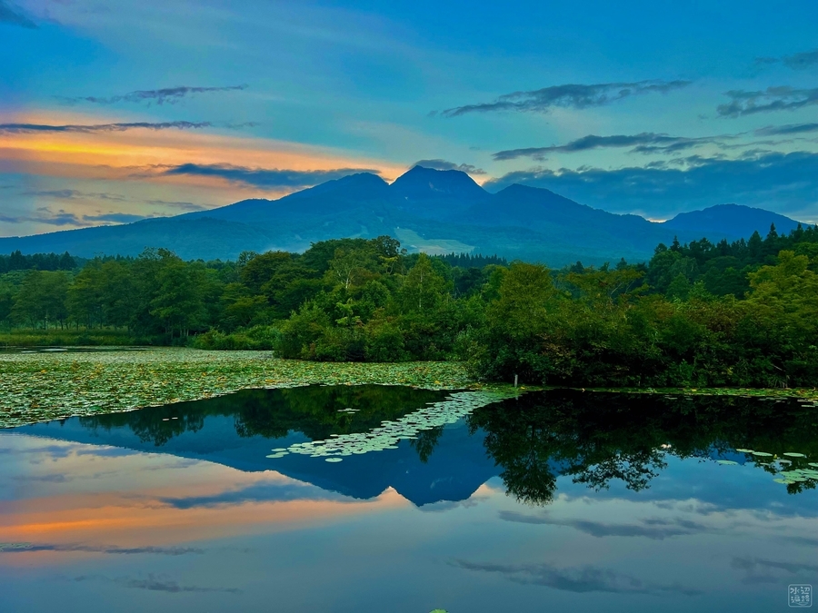 睡蓮ゆれる水辺のかなたに奇峰がつらなる。妙高の登山拠点。