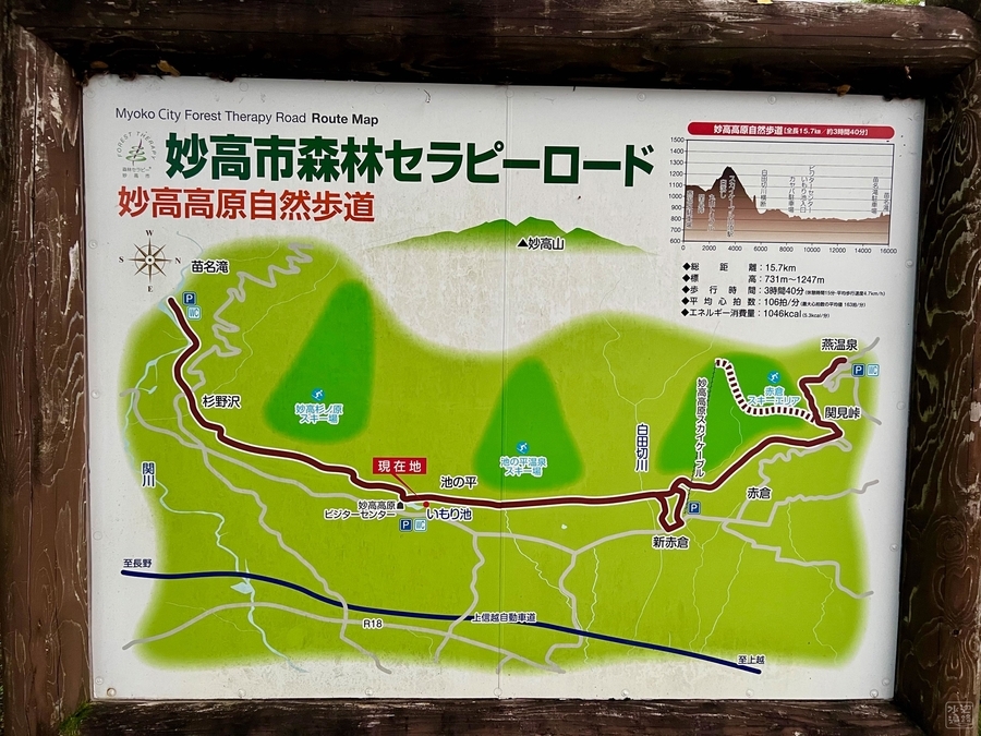 妙高の奇峰を背景にしたいもり池は、晴れていれば絵はがきのような姿を見せてくれる。一帯は「池の平」という地名の合宿向け高原温泉リゾートになっており、池畔には妙高高原ビジターセンターも。周辺にはレストラン、日帰り温泉など登山客向けの拠点として施設が充実している。
