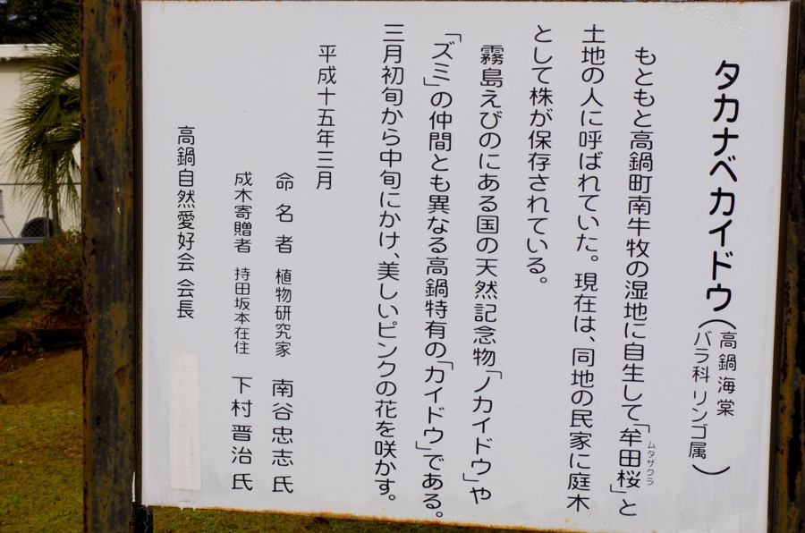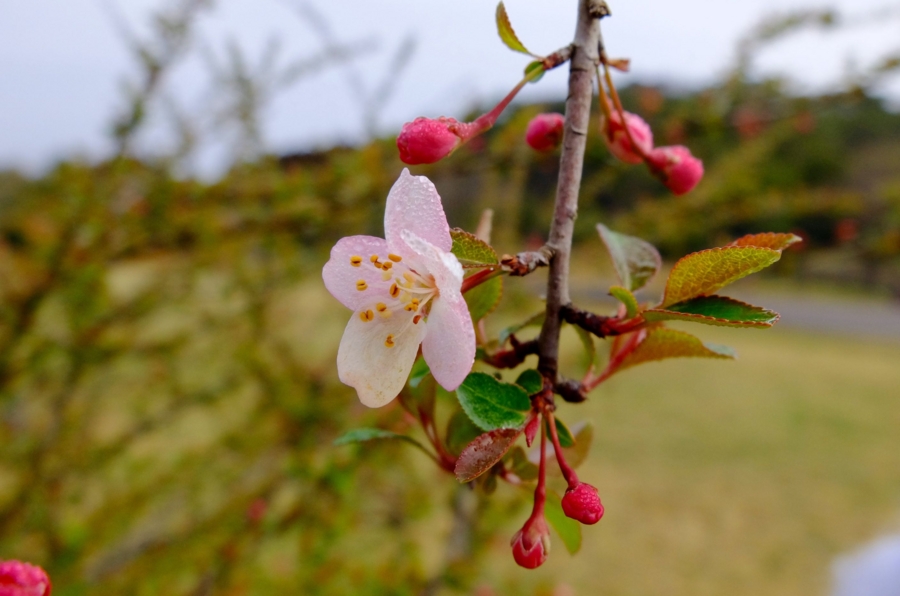 2016年の初訪時は開園期間前だったにもかかわらず、親切な管理人さんのはからいでタカナベカイドウの小さな可憐な花に会うことができた。
