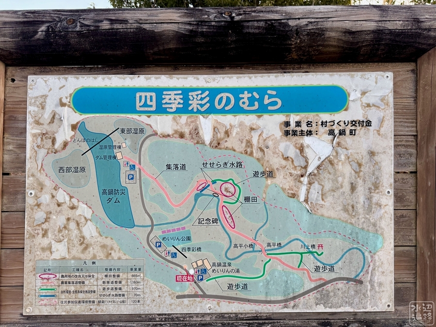 右岸の西部湿原と左岸の東部湿原は「とんぼの橋」という遊歩橋によって結ばれ、木道やあずまや、トイレ、駐車場が整備。入場無料。近くに日帰り温泉も。