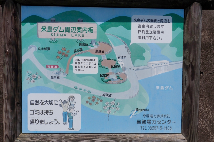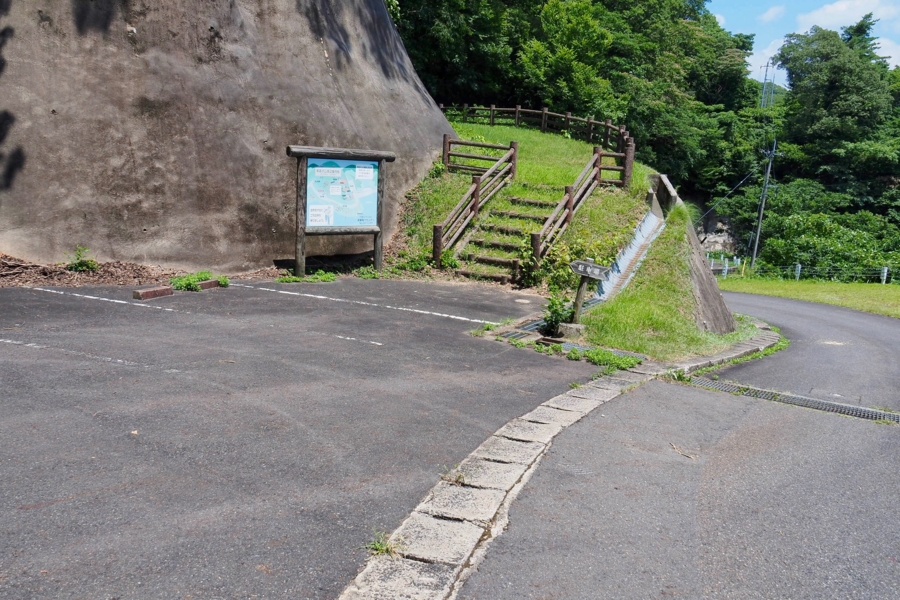 国道に上がって堰体の方をめざし、堰体へとつづく管理用道路に入るとすぐに来訪者用の小ぶりな駐車場と案内板が。