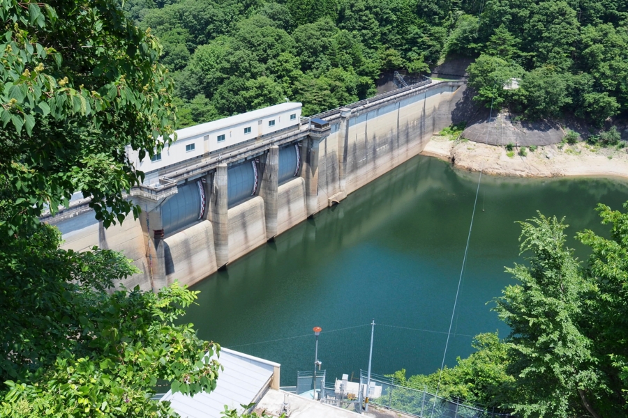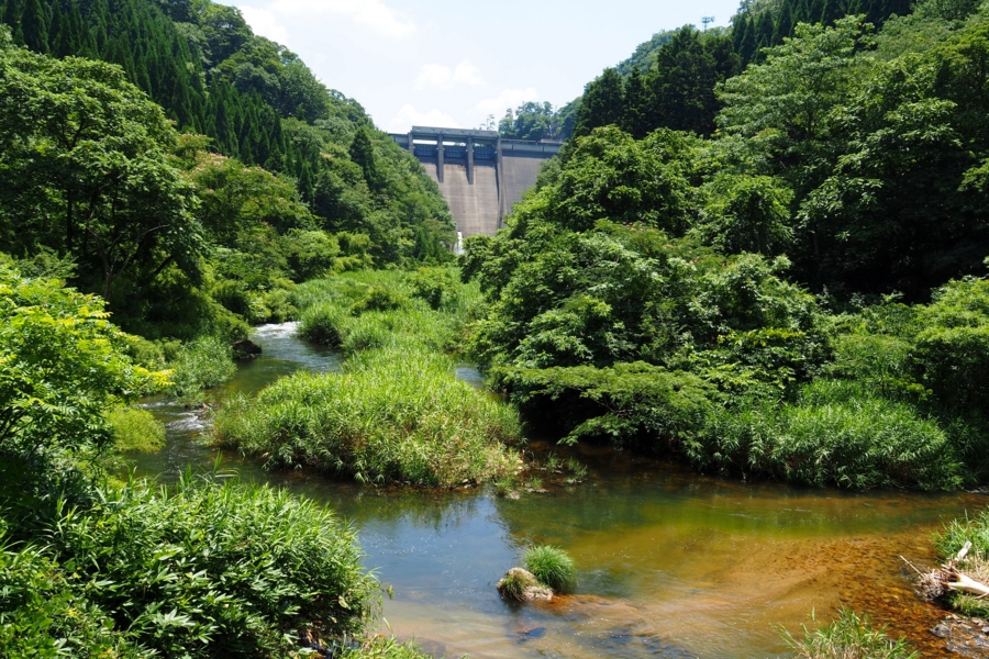 もう少しダム湖らしい写真がほしいと思い、堰体下から西岸側に出るあやしい細い道をおそるおそる進むと、ちらりと堰体が見えた。堰体下の渓流は思わずテンカラ竿を出したくなるような豊かな雰囲気。
