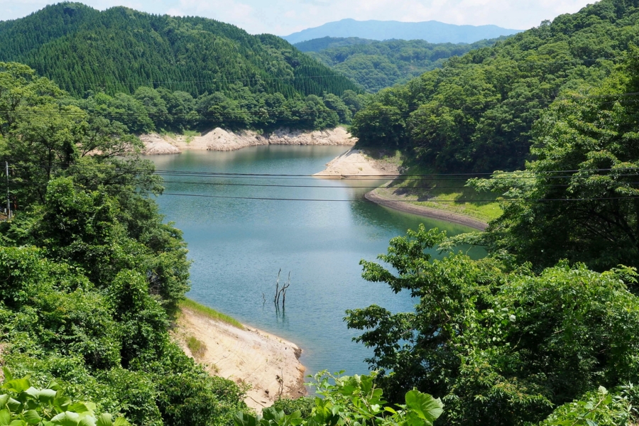 中国電力の発電用ダムで、狭隘な国道が湖のそばをかすめるように走っているが、樹形状に縦横に無数のワンドが入り組んだ貯水池なので、湖面が見えそうで見えない。
