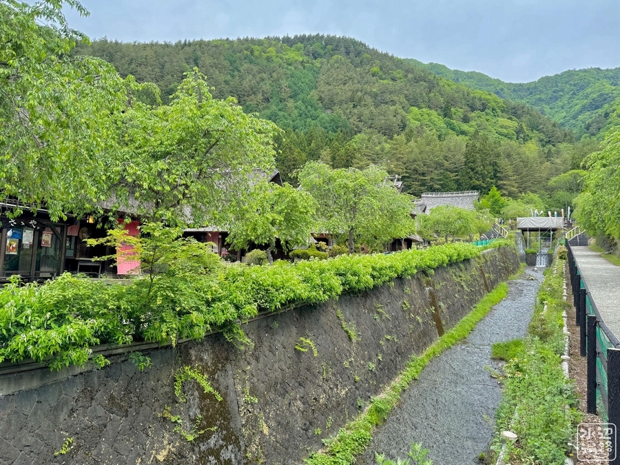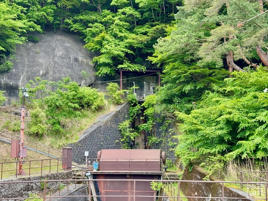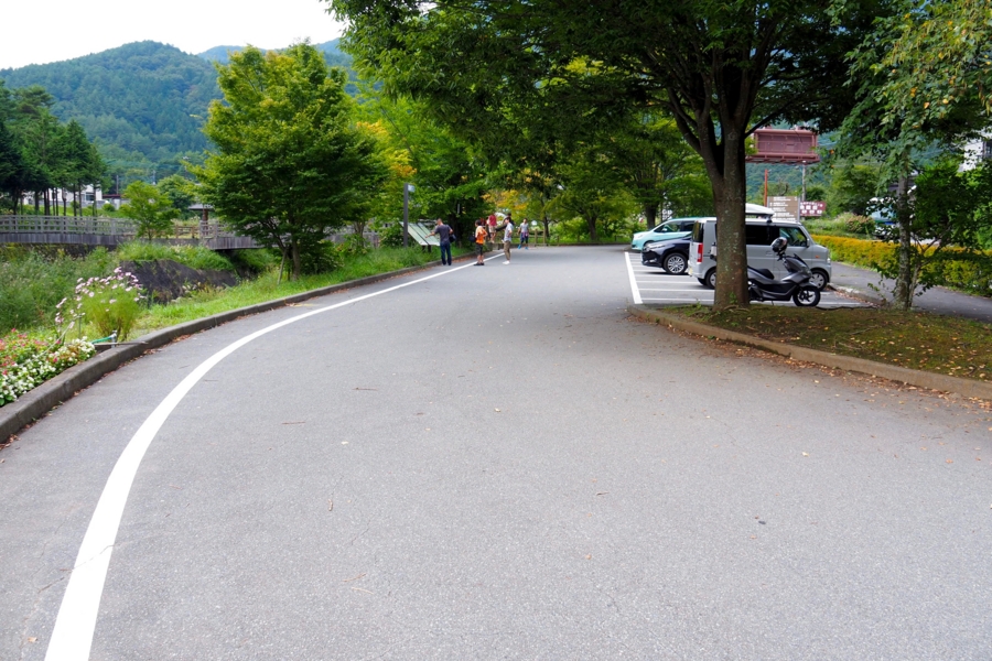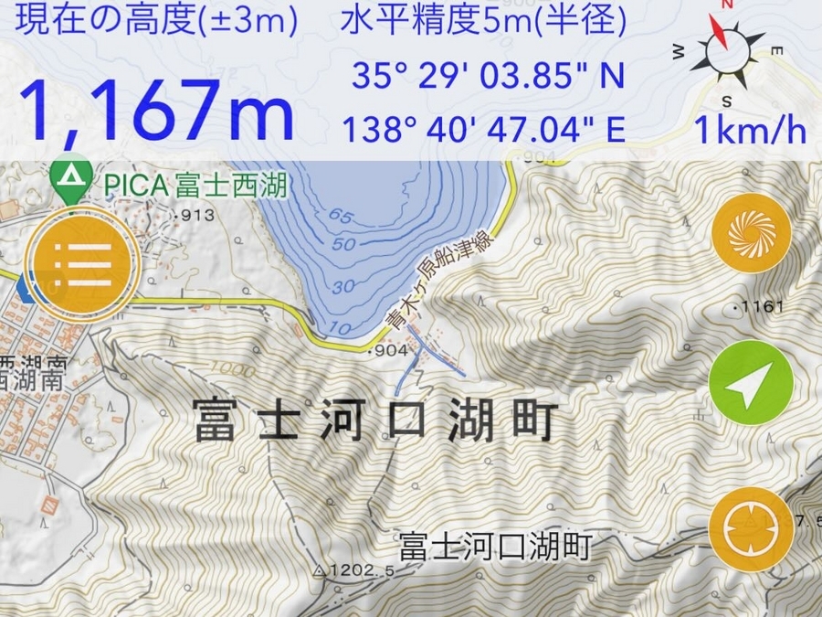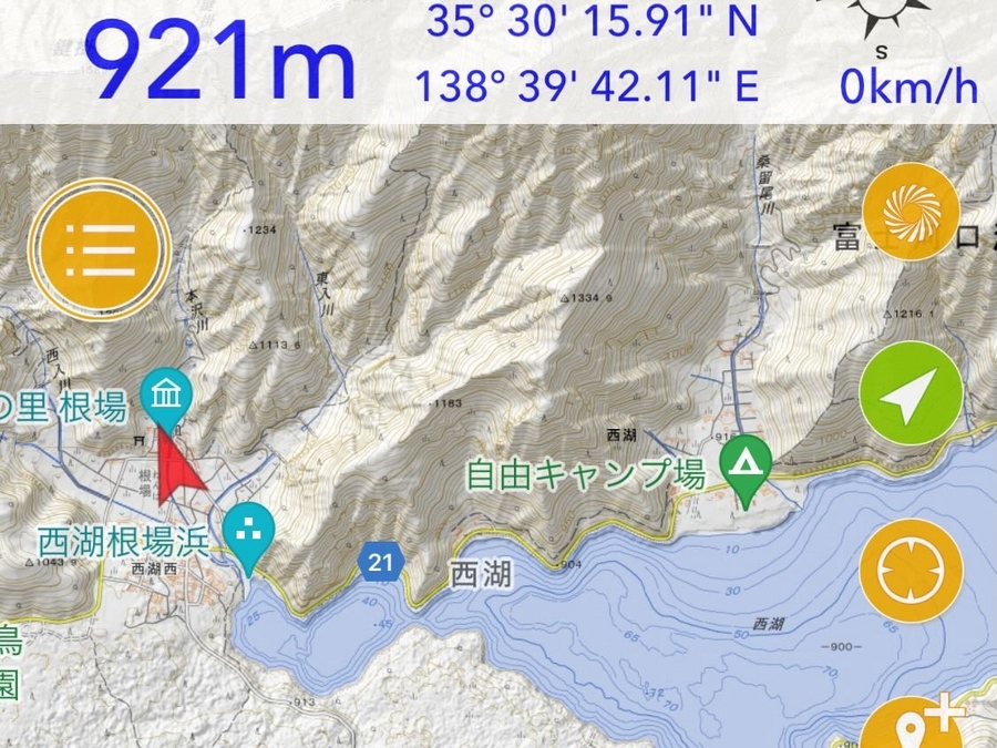 過去には大雨による増水で湖周道路がすべて冠水したこともあるが、現在は流出水路が人工的に設けられている。下は河口湖側の地形。道路はトンネルで結ばれている。