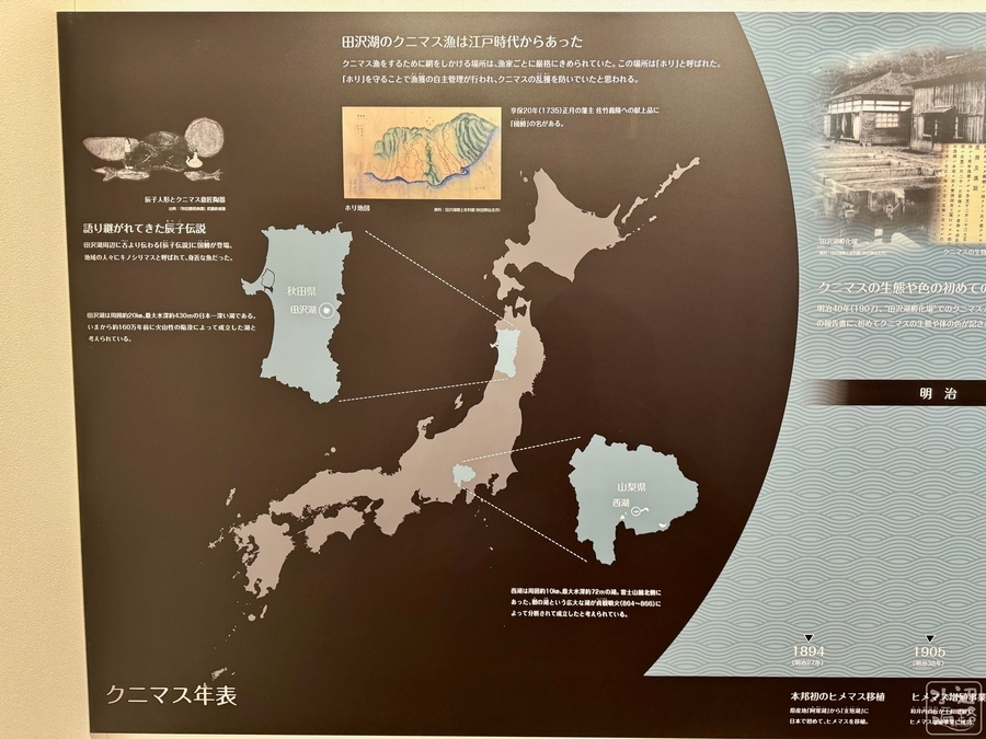 絶滅魚の正確なイラストを描こうとしたサカナくんが資料として西湖の「クロマス」を取り寄せたことが、70年ぶりの大復活劇の端緒となった。(写真はクニマス展示館)