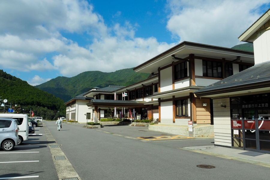 湖畔に温泉ホテルや役場などが一体化した道の駅もある。