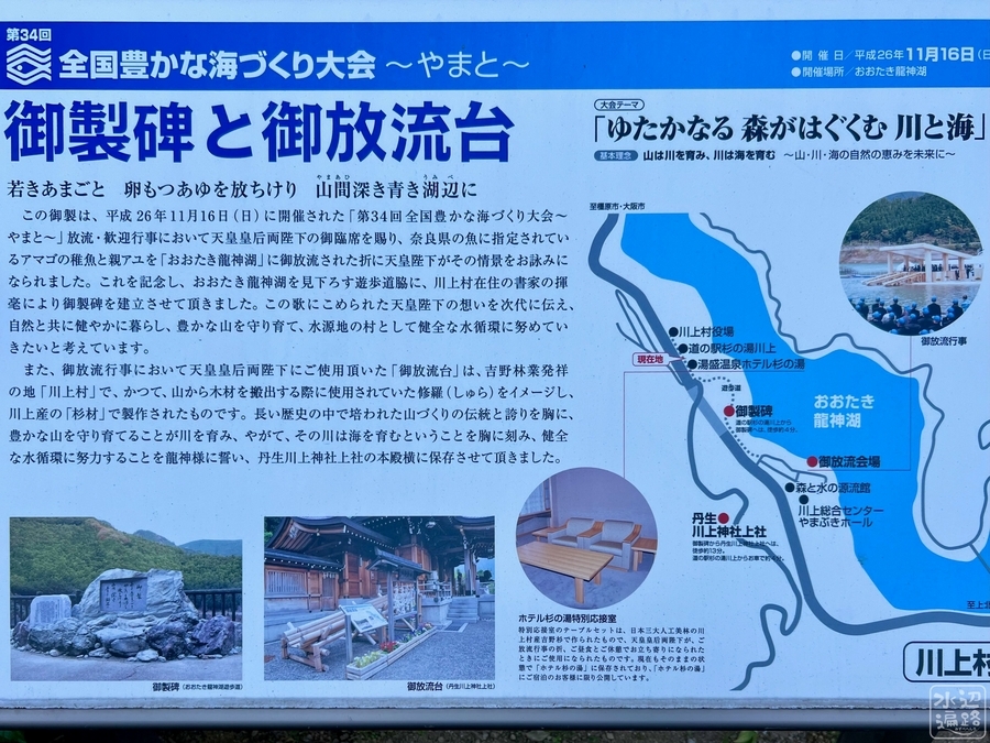 2014年には天皇陛下ご臨席のもと、アユと奈良県の県魚であるアマゴがダム湖に放流された。皇室が放流に関わった事例としては、第125代天皇(平成上皇)が皇太子時代にアメリカから持ち帰ったブルーギルを琵琶湖に放流した事例が有名である。なお上皇は後にブルーギルが日本の湖沼の生態系の脅威になっていることに触れて「心を痛めている」と語っている。