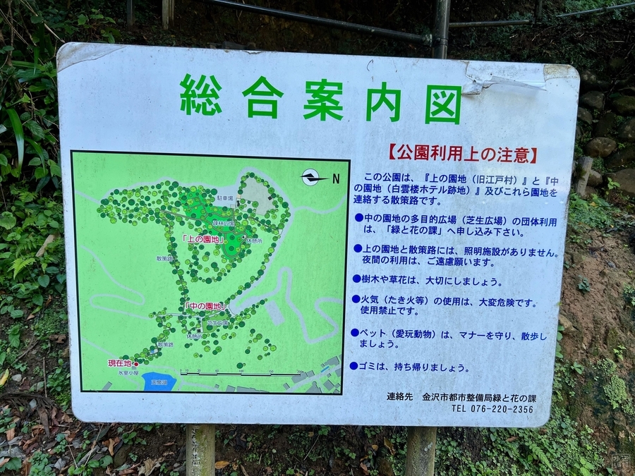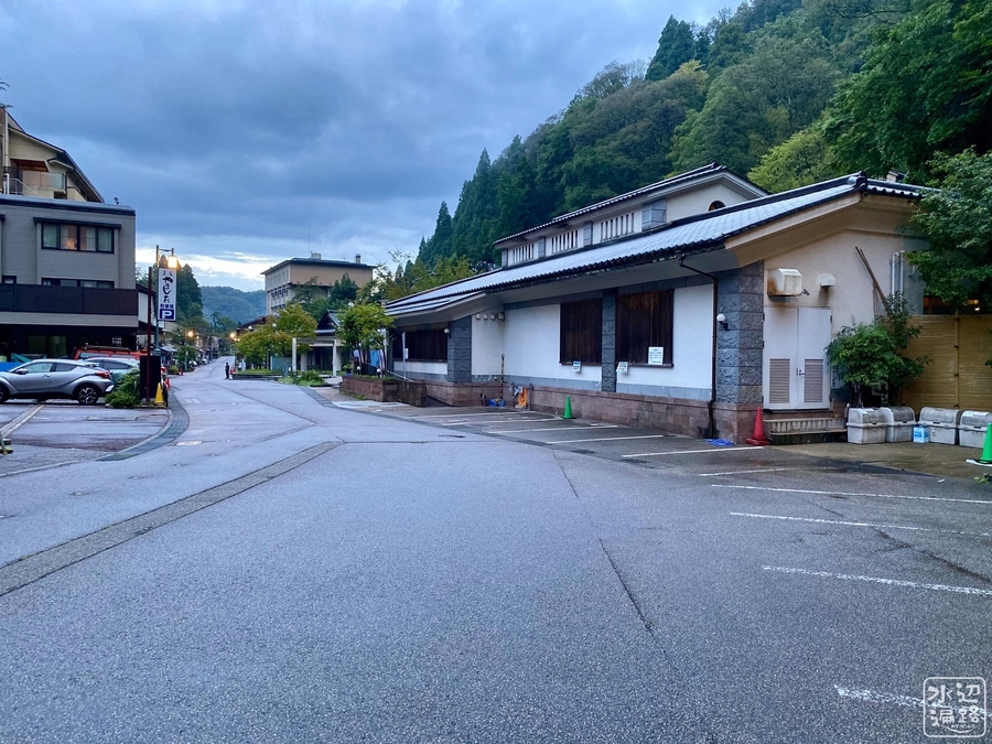 湯涌温泉の入口に大型案内マップと公衆トイレ付きの駐車場がある。