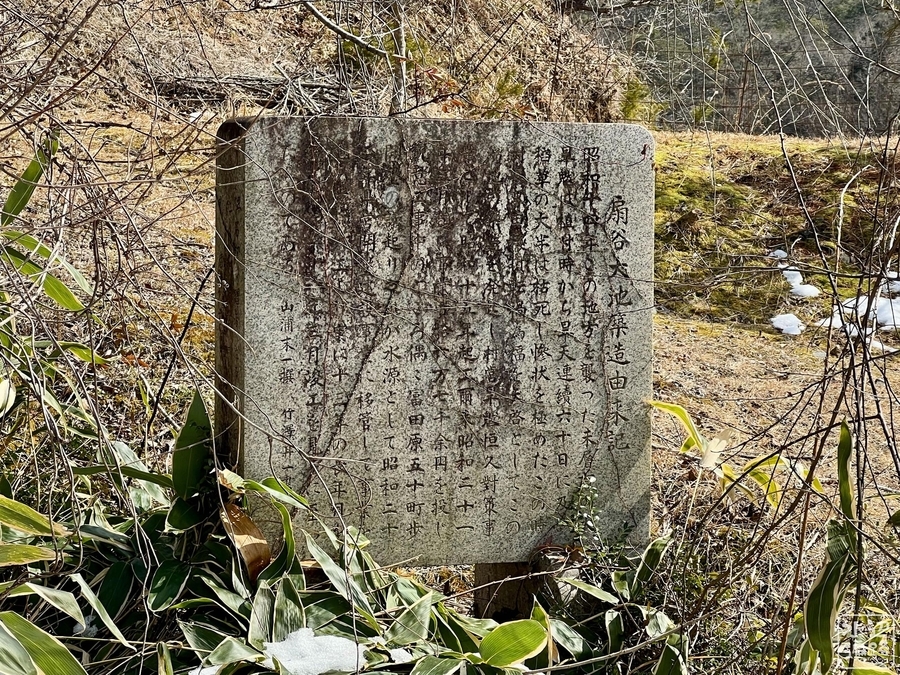 2022-05-15 扇谷池(広島県庄原) 中国 ダム おおぎたにいけ。 ハイダムスペックの農業用ため池。戦前に起工した溜め池としてはめずらしく、コンクリート堰体を持つ。ダムサイトに記念碑と休憩設備あり。 アクセス路は細いが舗装路。 マークした場所がアプローチ路入口。