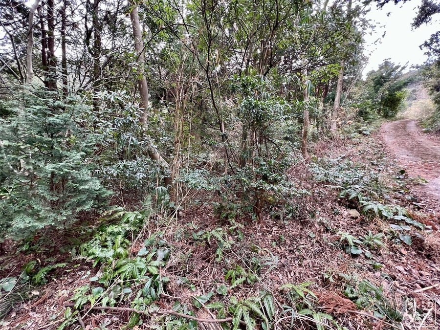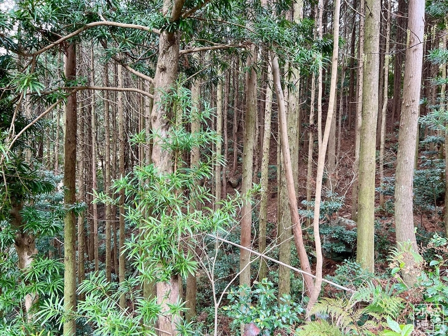いい感じの集水地形だが水源林はそれほど広くはない。堰体には斜めに駆け上がる犬走りが付いている。写真左手の左岸側中腹にアプローチ路がつながっているようにも見える。そして堰体直下には、先ほど歩いた林道も見える