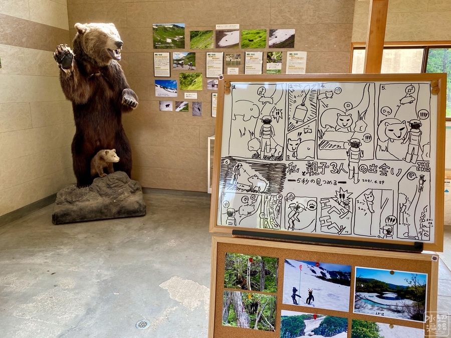 部屋からのドアが登山路入口になっている。ヒグマに関する資料あり。