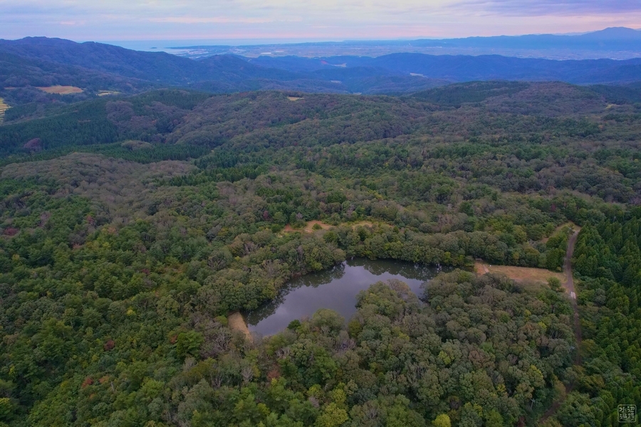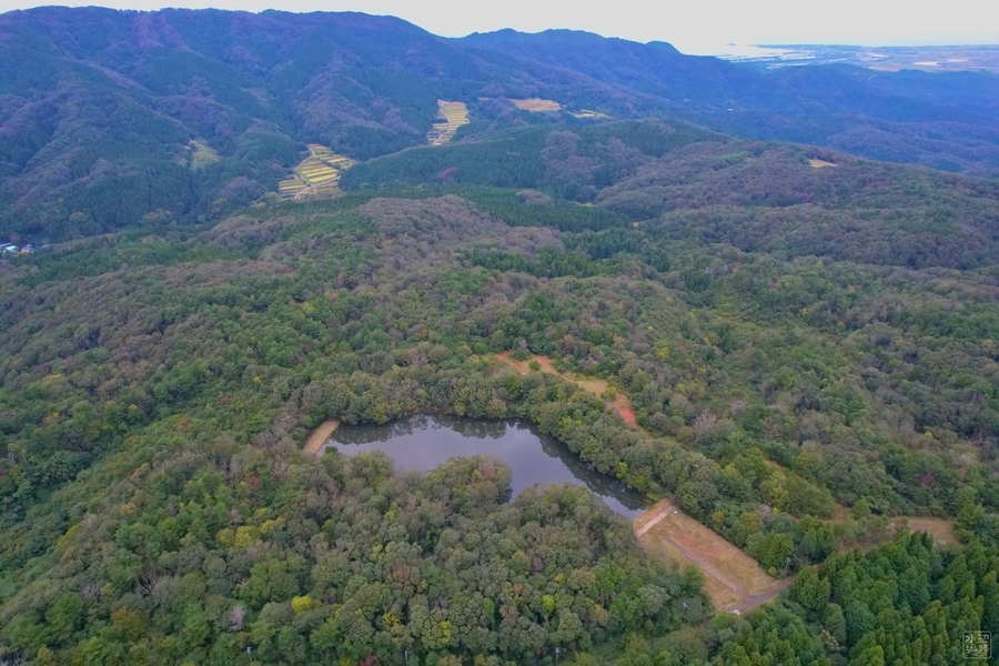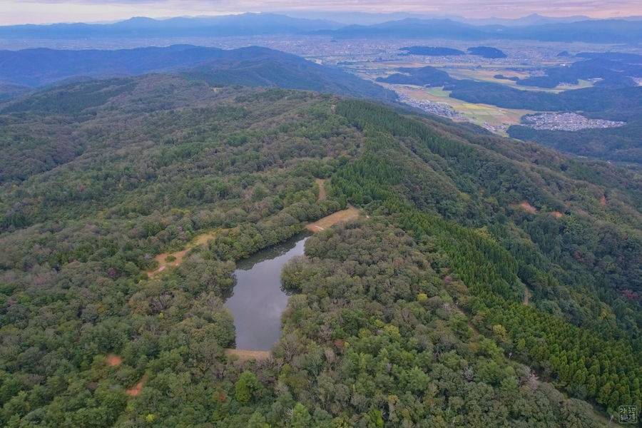 2022-09-23 追分の池(福井県福井) 北陸 追分の池。後ろに見えるのが福井市街地。越前海岸に流れ下る一光川水系の源流部の山中に設けられた溜め池。地籍は福井市であるが市街地には背を向けるかっこうになっている。インレット部が園地に。