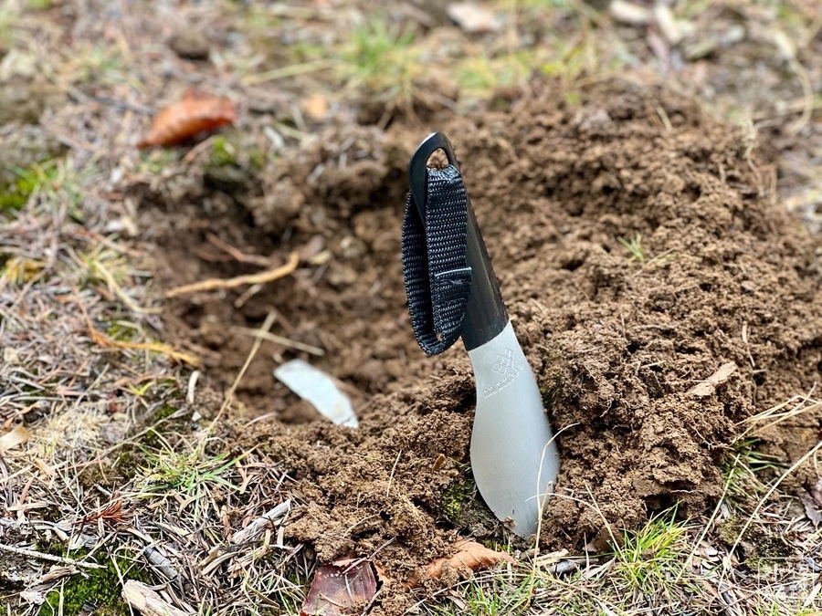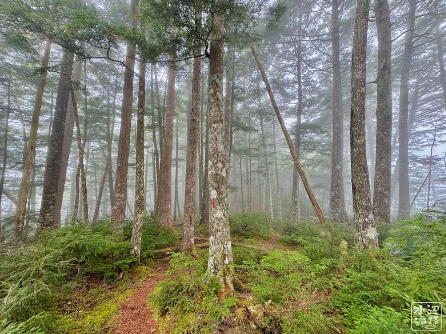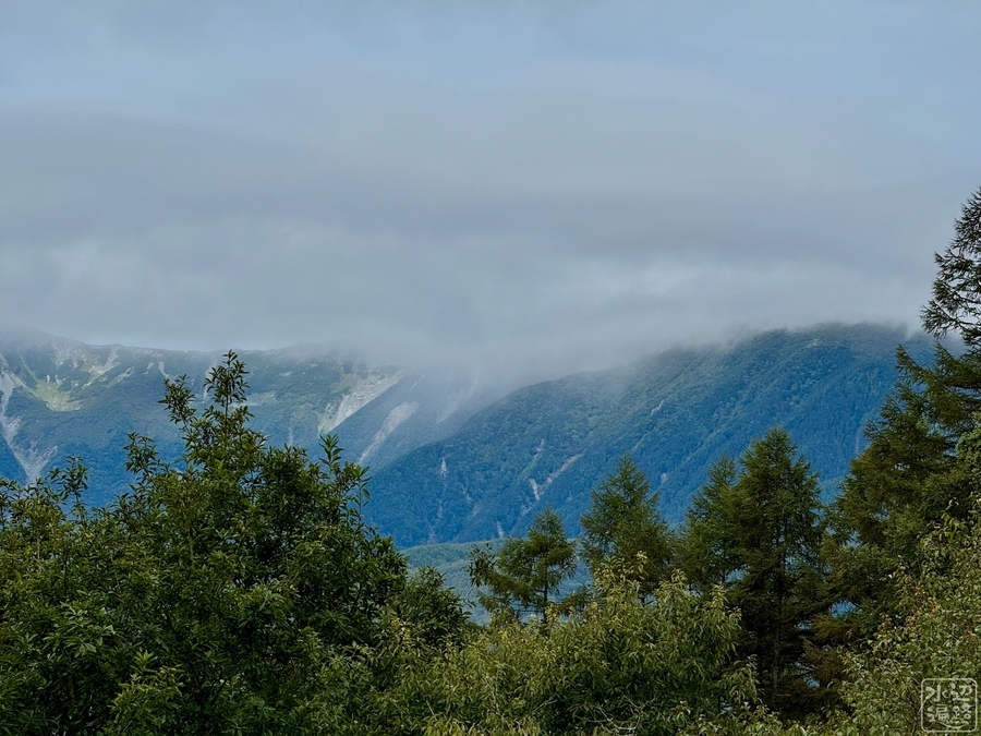 この区間で対岸の北岳稜線の眺望あったのは山火事跡だけ。ただし霧と雲でこの日は見通せず。ここでも1時間ほど晴れ待ちをしたが、だめ。待ち時間にザックに常備している荷物をチェック。新たに導入したモンベルのトイレスコップを試す。
